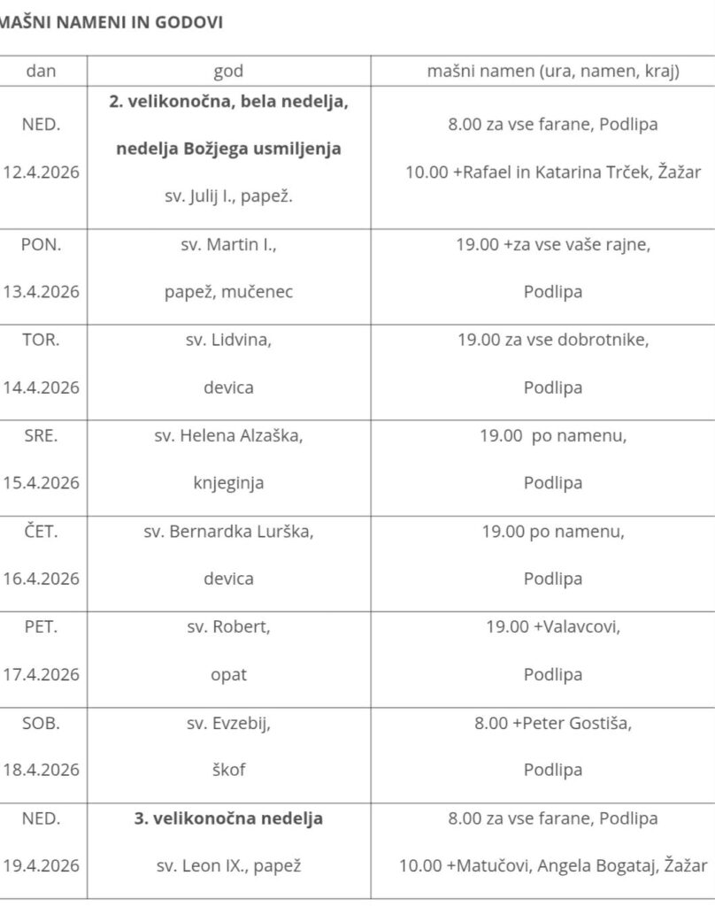 Ta teden bo v Žažarju maš samo v nedeljo 19. 4. ob 10.00 za Matučeve in Angelo Bogataj.