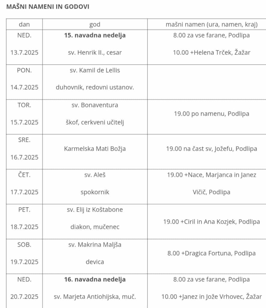 Ta teden bo v Žažarju maša v nedejo, 20.7. ob 10.00 uri, za Janeza in Jožeta Vrhovec.
