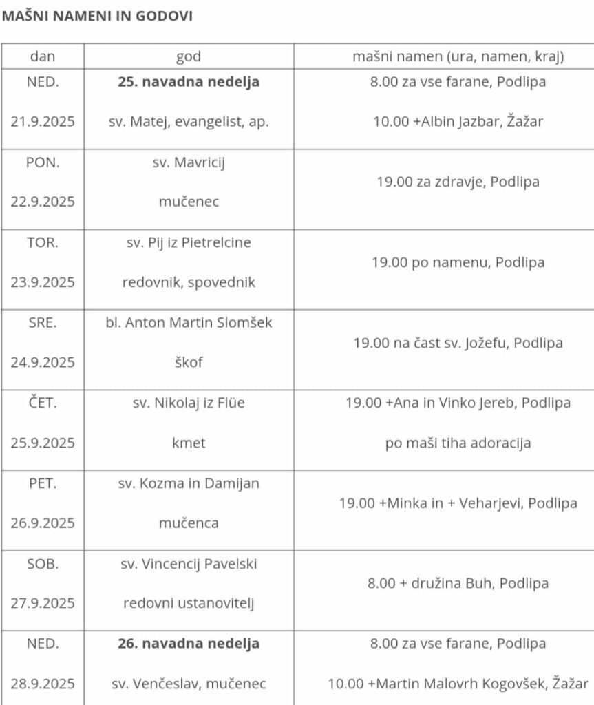 Ta teden med tednom v Žažarju ne bo maše. Maša bo zopet v nedeljo, 28.9. ob 10.00 uri, za Martino Malovrh Kogovšek.