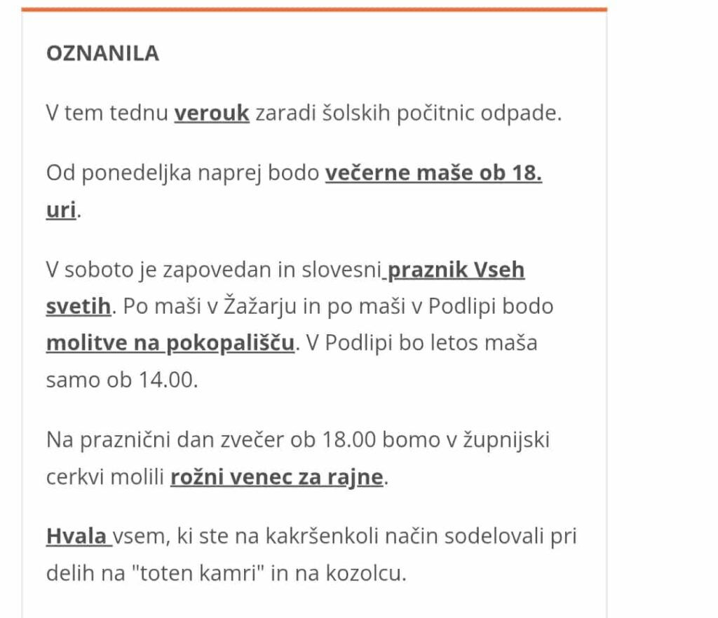 Ta, zadnji teden v oktobru nas je župnik prosil, da v Podlipi dvajset minut pred mašo organiziramo molitev rožnega venca farani iz Žažarja. Vabljeni k molitvi in večernim mašam v Podlipo.