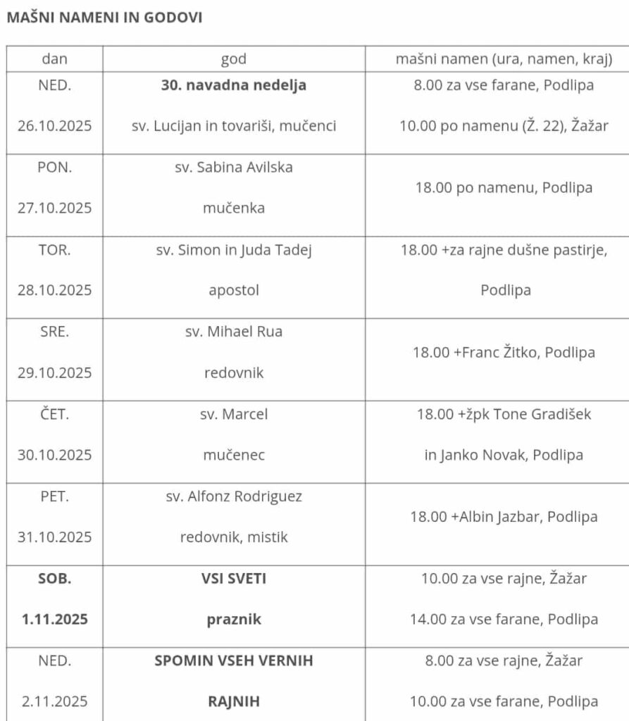 V Žažarju bosta maši 1. 11. ob 10.00 uri, za vse rajne. Po maši bodo molitve na pokopališču.