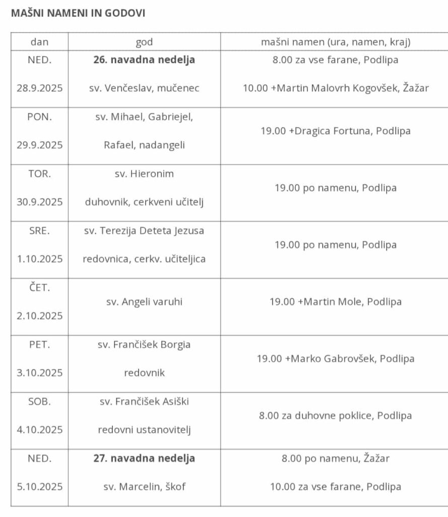 Ta teden bo maša v Žažarju samo v nedeljo, 5. 10. ob 8.00 uri, po namenu.