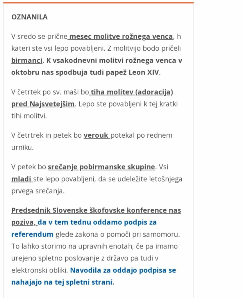 V sredo je začetek meseca oktobra, to je mesec rožnega venca, ko smo vabljeni k bolj redni molitvi rožnega venca. Vabljeni, da ob večerih zmolimo vsaj kakšno desetko rožnega venca. V župniji bomo molili rožni venec 20 minut pred vsako mašo. Začeli bodo birmanci. Vabljeni, da v tem mesecu pridemo k maši malo prej.