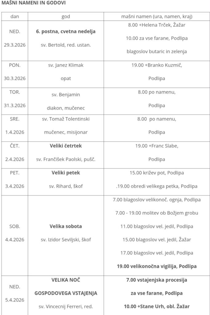 V Podlipi bosta ta teden v torek in sredo maši ob 8.00 uri.