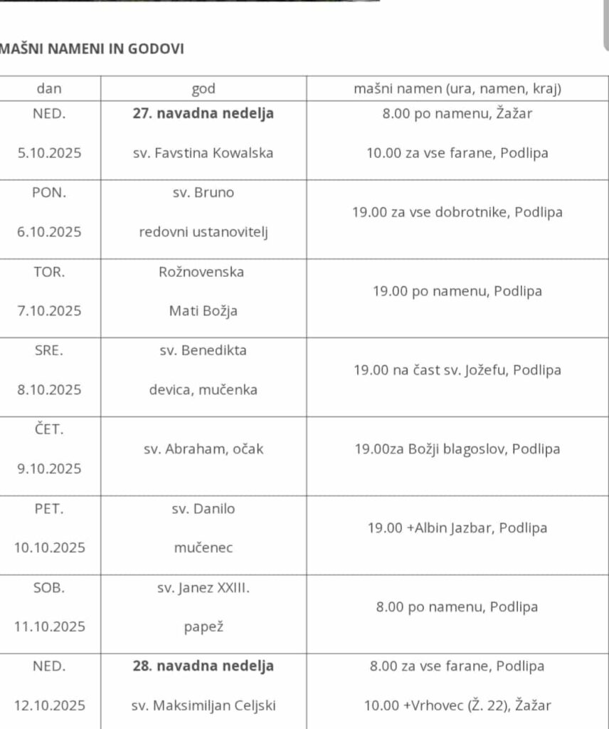 Ta teden bo maša v Žažarju v nedeljo, 12. 10. ob 10.00 uri, za pokojne Vrhovec, Žažar 22.
